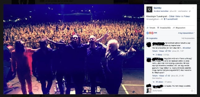 Közösségi média szempontból viszont annál inkább érdemes foglalkozni a kérdéssel, merthogy van itt ez a híres bejelölés, ami a bejegyzés mellé biggyesztődött, hogy tudniillik a Quimby zenekar Fidesz és Orbán Viktor társaságában volt Tusványoson – folytatja posztjában