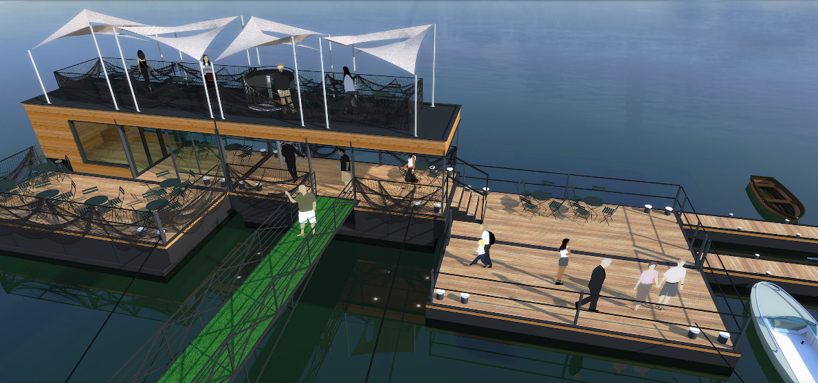 A teraszra fém csigalépcső vezet fel, itt helyezték el a grillteraszt és a kávézót a kis konyhával, melyre faborítás kerül. Az úszóműn a nyitvatartási időben külön személyzet gondoskodik majd a fedélzeten tartózkodók biztonságáról. Éjszaka zárt kapu, kamerarendszer és éjjeliőrök védik majd a létesítményt.