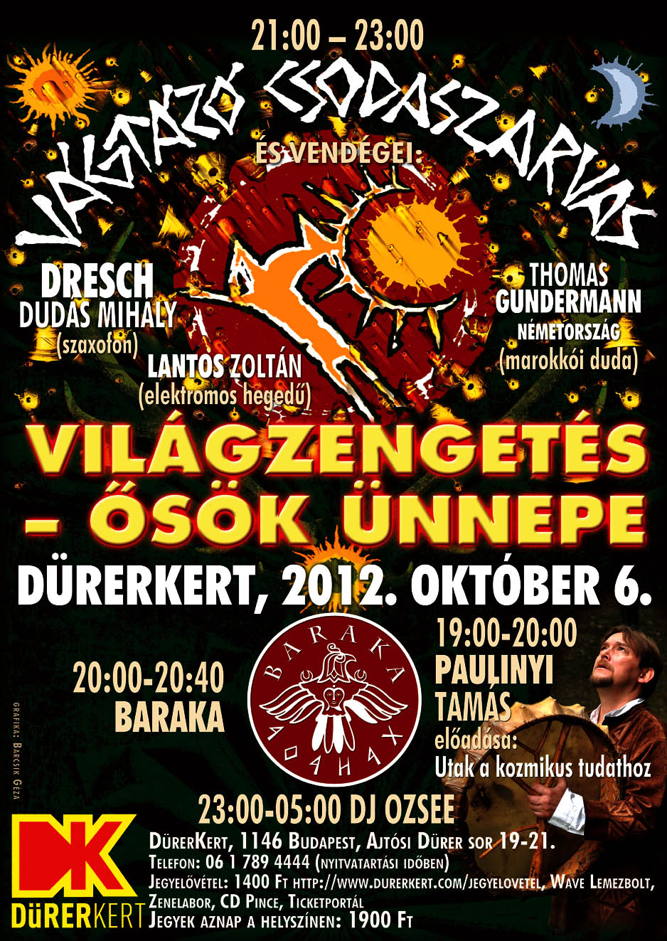 A Vágtázó Csodaszarvas koncertje előtt különleges dobfelszereléseken, állatbőrös dobokon, gitáron, kavalokon, furulyákon, didgeridoon, nagybőgőn, dorombon, csörgőkön szól majd a BaRaKa zenéje, akik a Táltos idő kerekén és Vérrel pecsételve című lemezeikről adnak ízelítőt. Az est különleges, spirituális élményéhez a ráhangolódást Paulinyi Tamás, a Szintézis Szabadegyetem igazgatója, kitűnő előadója, költő, író és parapszichológus adja „Utak a kozmikus tudathoz” című előadásával.