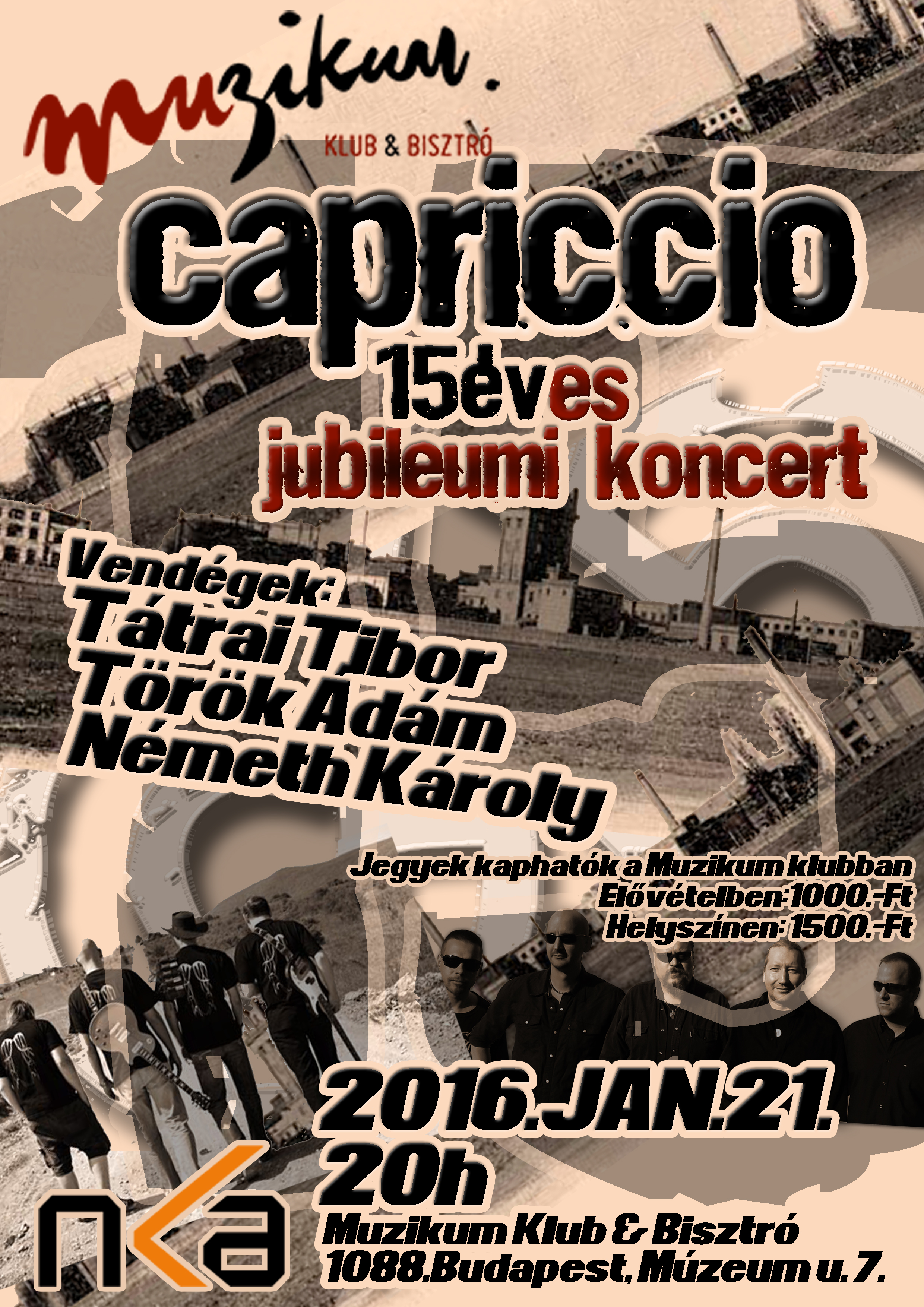 2016. január 21-én, csütörtökön 20 órai kezdettel a Capriccio zenekar jubileumi koncerttel készül megünnepelni fennállásának tizenöt éves évfordulóját. A Muzikum Klub & Bisztró (Bp. VIII. Múzeum u. 7.) színpadán a jelenlegi felállás – Radovics „Kyru” László – ének, Gazdag Viktor – gitár, Zsoldos Tamás – basszusgitár, Kecskés „Kecsi” András – ritmusgitár, Tóth „Diza” Dénes – dob, valamint Bartók Máté – szaxofon – mellett azok a zenészek is fellépnek, akik az elmúlt másfél évtized alatt megfordultak a bandában. Capriccioék rajtuk kívül sztárvendégeket is várnak Tátrai Tibusz, Török Ádám, valamint Németh Károly személyében.