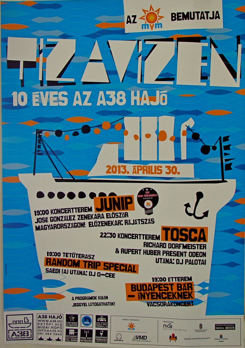Egy évtized alatt sokan jártak a jó hangosításáról híres koncerthely színpadán. Aki nagyon kíváncsi a névsorra, megtekintheti az ünnep alkalmából rövidesen megújuló www.a38.hu egyik aloldalán, és ha meg szeretné nézi a filmek valamelyikét, az archívumra kattintva arra is lesz módja. Indul egy blog is, mert a jól áttekinthető, elsősorban funkcionális nyitófelület mellé kell egy olyan rész is, amely további, színes részletekkel szolgál. Ami meg az emlegetett hangosítást illeti, jövőre 500 órás hangmesterképzést indítanak, így még az is megeshet, hogy a diák egy Grammy-díjas hangmérnök mellett hospitál majd valamelyik külföldi fellépő koncertjén.