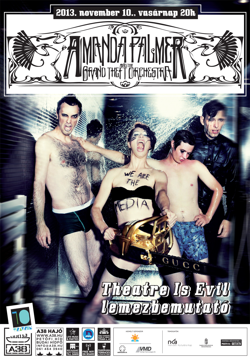 Amanda Palmer, vagy ahogy magát előszeretettel hívja, „a kibaszott Amanda Palmer”, a Dresden Dolls egykori énekesnője, a szókimondó, orfeum- és varietémániás anti-popdíva új albumának európai turnéját idén tavasszal törölte ugyan, de már akkor megígérte, hogy az elmaradt koncerteket hamarosan pótolja. S lőn. A tavaly szeptemberben megjelent, és mindenki által az egekbe dicsért Theatre Is Evil című lemezt saját zenekara, a Grand Theft Orchestra élén mutatja be a Hajón. Érdekessége a lemez kiadásának, hogy a felvételek költségeire a Kickstarter nevű „adománygyűjtő” weboldalon szedte össze a pénzt – pár hét alatt nem kevesebb, mint 1,2 millió dollárt, ami még a sokat látott producer-rókákat is sokkolta... Nem véletlen, hogy amikor a lemez turnéjára zenész-önkénteseket keresett (akiknek „sörért, pólóért és ölelésért” kellett volna koncertezniük az adományokból immár milliomos művésznővel), Steve Albini nemes egyszerűséggel leidiótázta. A kísérlet mindenesetre többek szerint alapjaiban változtatta meg a kortárs zenefinanszírozás módszereit, és Amanda Palmernek a projektet ismertető előadása hetek alatt a legnépszerűbb videó lett az ismert prezentáció-portálon, a TED-en, millós nézettséget elérve.