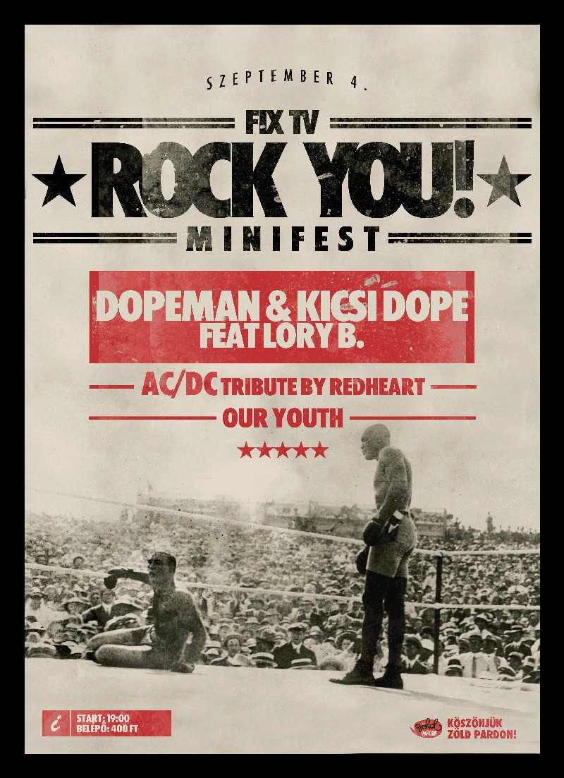 A FIX TV rock műsorának szezonzáróján a szervezők azt a hangulatot szeretnék odavarázsolni, amikor a rap és a rock megfért egy fesztiválon és szívesen játszottak egy színpadon. Ez egyébként sokat van így manapság is nagy rendezvényeken. Úgyhogy a Rock You minifesten két rock banda után Dopeman fogja szórakoztatni a közönséget az egykori Kartel taggal Lory B.-vel.