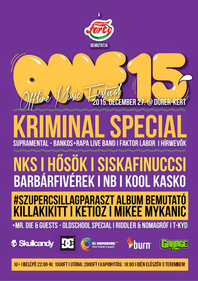 Túlzás nélkül állíthatjuk, hogy idén a legszínesebb fellépő-armadára számíthatnak azok, akik az OMF-en töltik ezt a napot. Az este egyik szenzációja, hogy sok év szünet után Rapa (Az Idő Urai, Firma) újra színpadra áll Bankossal, hogy együtt debütáljanak legújabb élőzenés formációjukkal, a Supramentallal. Klasszikus daraboktól a vadonatúj szerzeményekig prezentálják termékeny életművüket olyan vendégekkel, mint Faktor Labor, Hírwevők, Kool Kasko és Ponsa. Egyébként a Kriminal Crew még az NKS-t is teríti, hogy teljes legyen a kép.
