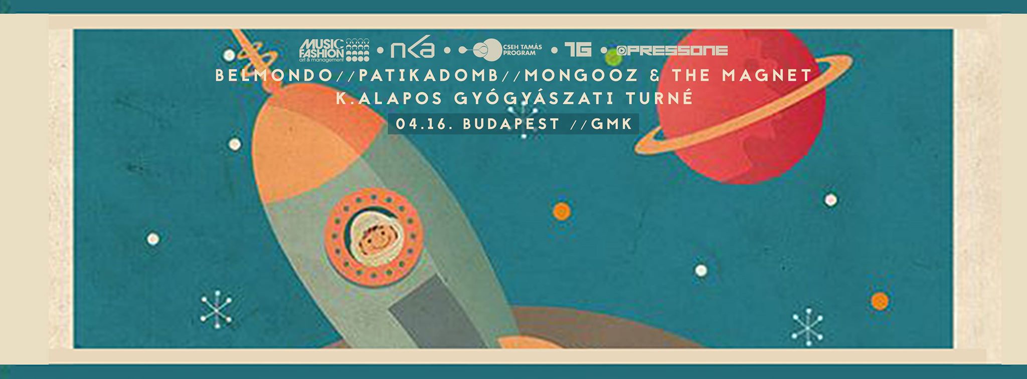 A csapat természetesen nem egyedül indult útnak, a több állomásos bulin részt vesz a Patikadomb is. A trió egy 2013-ban alakult feltörekvő zenekar, akiknek a Süssön című dalát, illetve az októberben elkészült Mechwart ligetet szintén rotációban játszotta a Petőfi Rádió. A Patikadomb újdonsággal is készül a budapesti koncertre, hiszen legújabb, nemsokára online is megjelenő dalukat, a Nézd csakot is eljátsszák majd! A dal április 13-án debütált a Petőfi Rádióban.