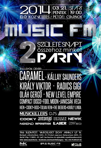 Eltelt tehát két év és a rádió ismét egy nagy, közös, szülinapi ünneplésre hoz össze minket. Március 21-én este 7-től indul a buli, ahol fellépnek hazai pop-ikonok, így Caramel, Oláh Gergő, Tolvai Reny, a Compact Disco, Bogi, Dukai Regina, Janicsák Veca, The Biebers, Hien, a Fool Moon, a New Level Empire, Kállay-Saunders, Radics Gigi, Király Linda és Király Viktor. Az est során lemez mögé allnak majd MusicKillers DJ-k, nevezetesen Dj Metzker Viktória, Antonyo, Lauer, No!End, DJ Revolution, Compact Dj Lotfi Behnam, DJ Newik, aki 2013-ban az “év felfedezettje” díjat nyerte, valamint Cooky, aki pedig a legnépszerűbb rádiós volt a közönség szerint 2013-ban.