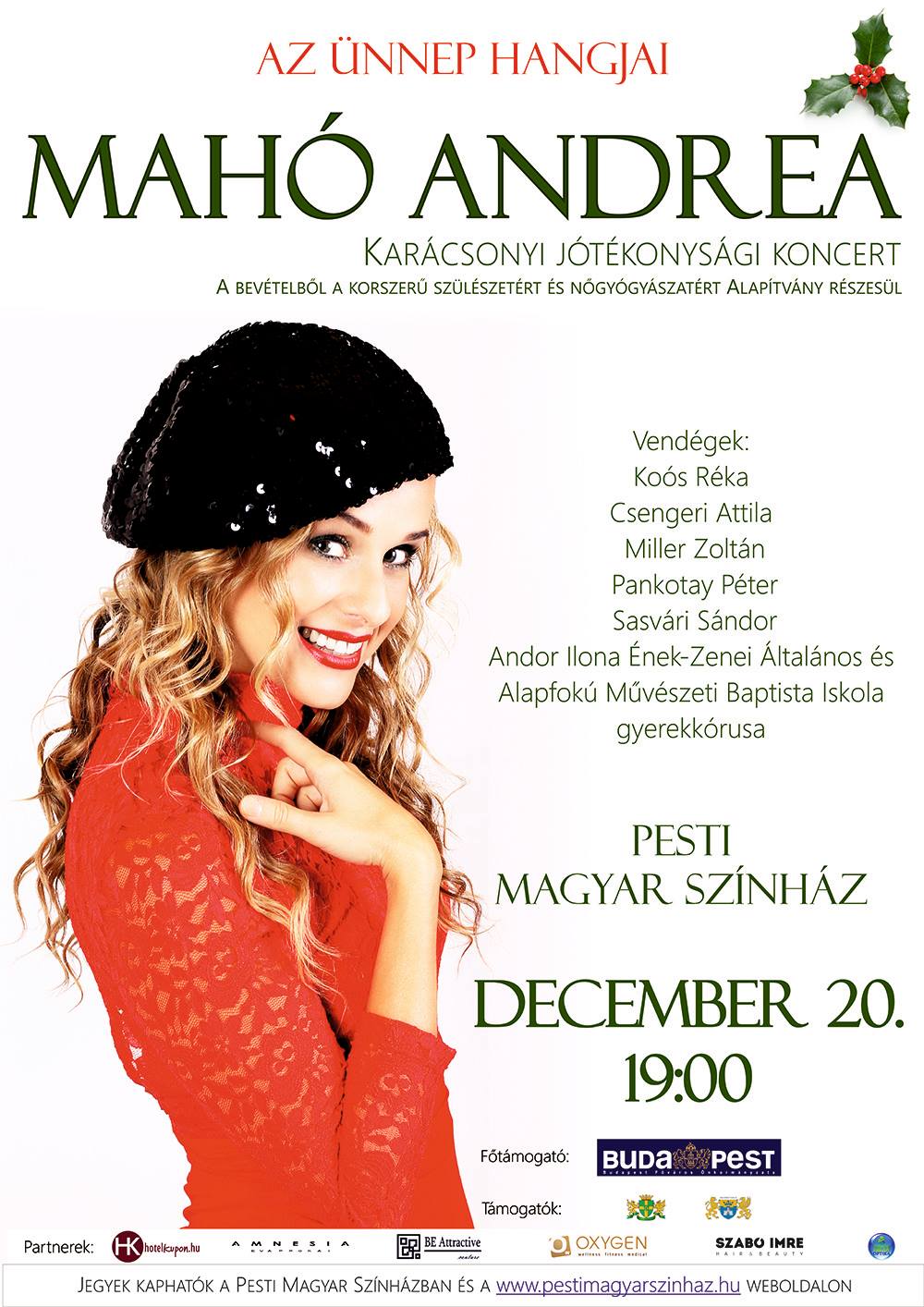 Mahó Andrea (eMeRTon és Artisjus díjas színésznő, énekesnő) 2015. december 20-án, advent harmadik vasárnapján egy nem mindennapi előadásra készül "Az ünnep hangjai" címmel, ahol az ünnepi hangulat egy varázslatos zenei élménnyel párosul. A legszebb ünnepi klasszikusok és a karácsony legvidámabb dalai, a Csendes Éj, Ave Maria, Fehér karácsony társaságában számos más sláger is elhangzik majd az este folyamán.