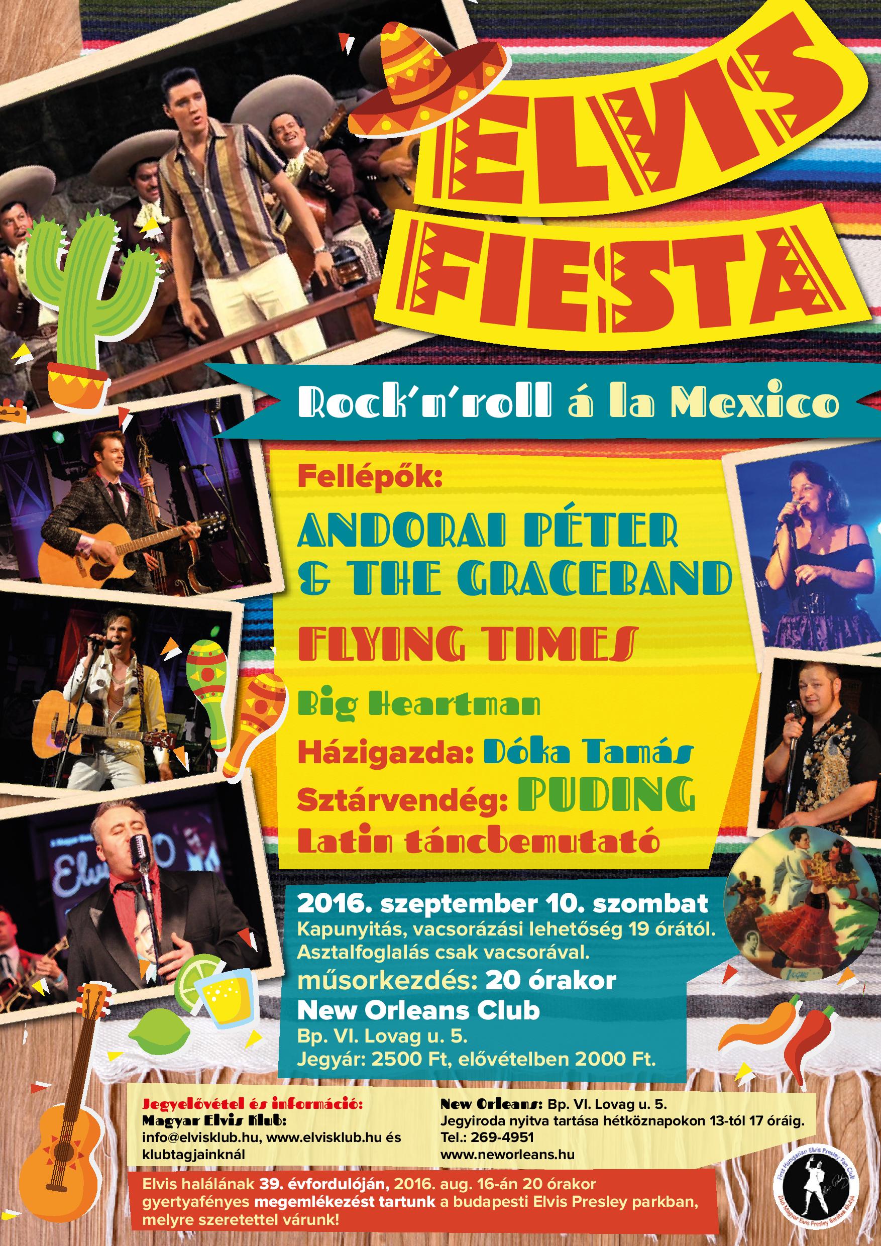 A zenés produkciókon kívül latin táncbemutató gazdagítja a fergeteges hangulatot ígérő mexikói táncmulatságot. Aki szeretné részt venni a szombati Elvis Fiestán, jobban teszi, ha lefoglalja a jegyét a New Orleans Clubba (Tel: 269-4951), mert a terem befogadó képessége véges, Elvis rajongóinak tábora viszont, úgy tűnik, hogy majd’ 40 évvel a halála után is egyre csak nő.