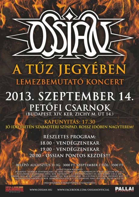 Szeptember 14-én, a Petőfi Csarnokban mutatja be idén megjelent új nagylemezét az Ossian zenekar. A Tűz jegyében című album sikerei méltóak az együttes máig töretlen, országos népszerűségéhez: a 10 új dal néhány hét alatt aranylemezzé érett, s nem csak a slágerlistákon szerepelnek jól, hanem a videómegosztó oldalakon is százezres nézettséget produkálnak.