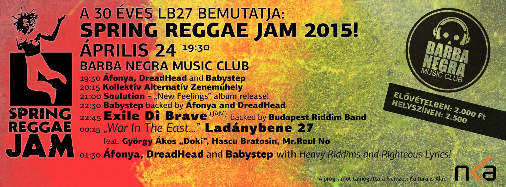 Bemutatkozik a Kollektív Alternatív Zeneműhely is, Szombathelyről pedig egyenesen vadiúj, New Feelings című albumával érkezik a Soulution. Jamaicát ez alkalommal az az Exile Di Brave képviseli, kinek szigetországi mentalitásával fő célja, hogy szórakoztassa és feldobja az embereket. A reggae-n, dancehall-on és hip hop-on nevelkedett előadó 2003-ban, fősulis évei alatt kezdte karrierjét hip hoppal, majd visszakanyarodván gyökereihez tért a reggae útjára. Pénteken új, The Journey Begins című lemezével, a Budapest Riddim Band kíséretében érkezik a Barba Negrába.