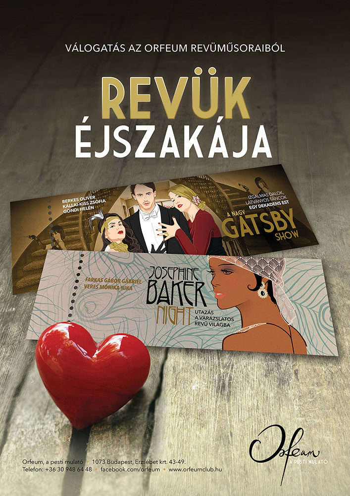 Berkes Olivér, Farkas Gábriel, Veres Mónika NIKA, valamint 6 kiváló táncos A Nagy Gatsby Show, a Josephine Baker Night és korábbi Orfeum-revük egyvelegét hozzák el.