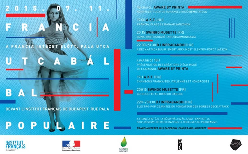 Az esemény alkalmából a Duna-parti helyszín valódi szabadtéri lokállá változik. A magyar A.K.T. színésznő-zenekar (Takács Panka, Miklusicsák Alíz, Nemes Szabina és Palóc Eszter) francia, olasz és magyar sanzonokat ad elő, a francia Swingo Musette tangóharmonikával kísért kabaréműsorral készül, a francia elektro-pop rajongóinak pedig DJ Infragandhi későesti fellépése nyújt szórakozást.