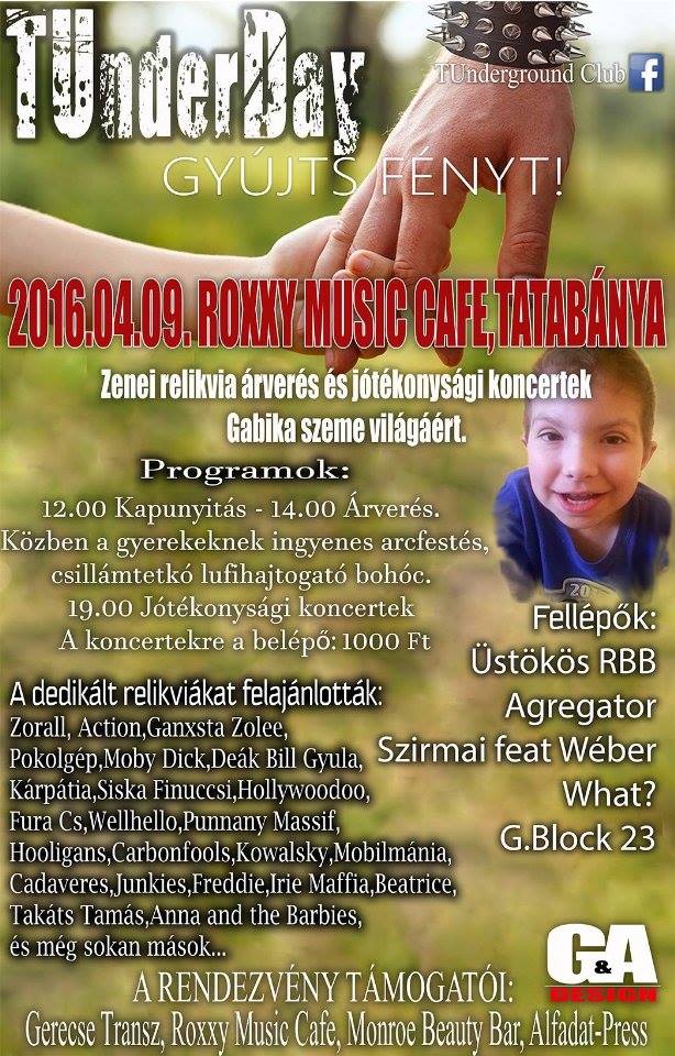 A jótékonysági napot április 9-én, szombaton rendezik, TUnderDay néven, Gyújts fényt! mottóval. A licitálás kb. 15:00 órától kezdődne, az esti koncertek már viszonylag korán 19:00, 20:00 óra magasságában. Fellép az Agregator, az Üstökös Rock Blues Band, a G. Block 23, a What?, valamint Szírmai feat Wéber.