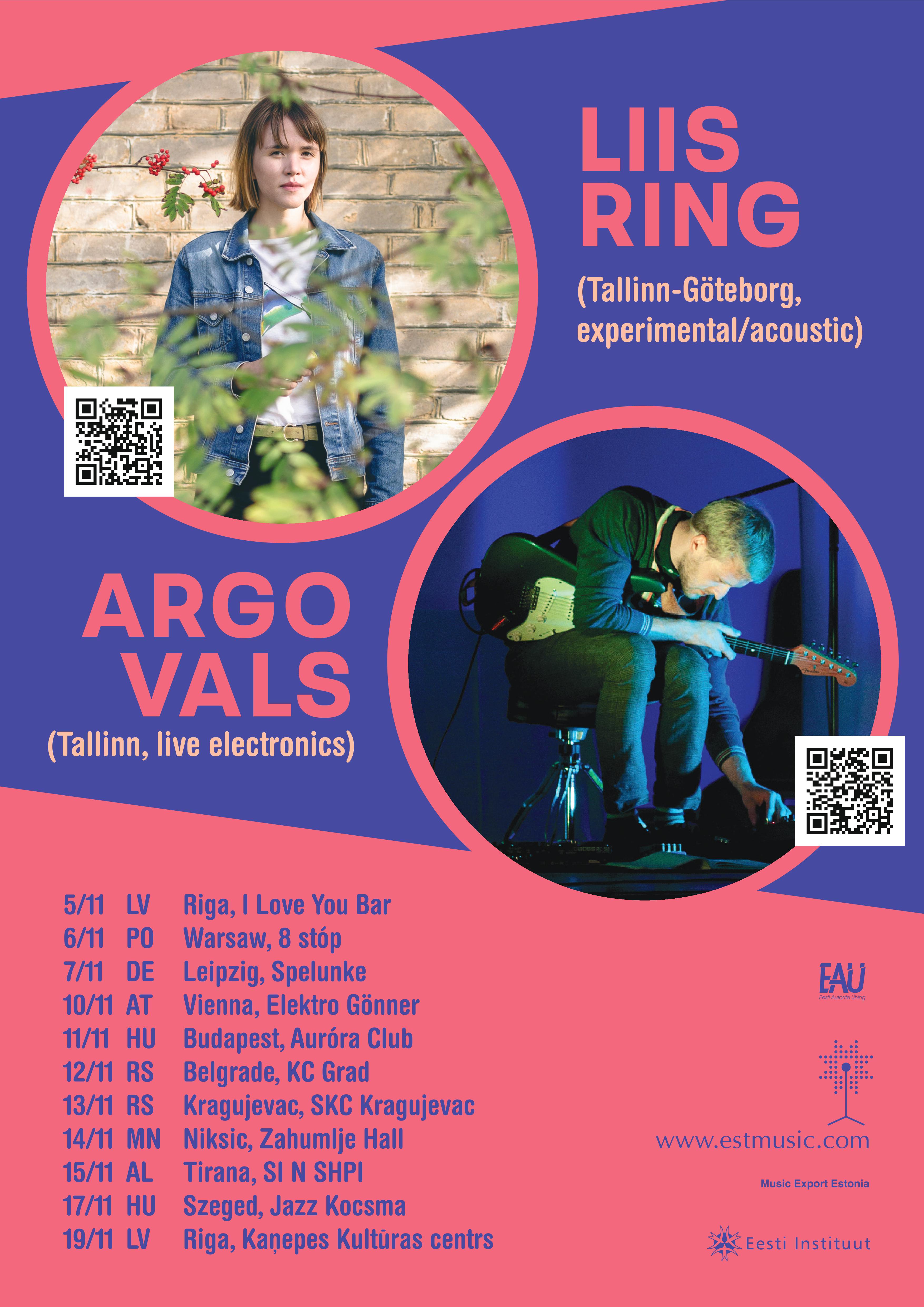 Liis Ring babázás helyett már tíz évesen saját szerzeményei írásával és rögzítésével foglalatoskodott legszívesebben, ám szólóművei csak 2013-ban kerültek ki a hálószobájából az EestiPops kiadó és a Kohviradio online rádió DJ-inek köszönhetően, akik SoundCloudon fedezték fel a különlegesen tehetséges zenészt. Liis Göteborgban él és alkot, zenéiben az RnB, az indie pop és a jazz lép házasságra, de komolyzenei elemek is felbukkannak műveiben. Első lemeze, a Fables of a Faraway Land cirkl művésznéven jelent meg, két másik tehetséges zenész kíséretével, a bensőségesebb dalait azonban egyedül, Liis Ringként adja elő. Magához ölelő finom csengésű muzsikájával már fellépett a Tallinn Music Weeken, a Positivus Fesztiválon, az Intsikurmu Music Fesztiválon, most pedig Argo Valsszal közösen turnéra indul, így Albánia, Lengyelország és Ausztria után november 11-én az Észt Intézet közreműködésével Budapestre is megérkeznek az Aurórába.