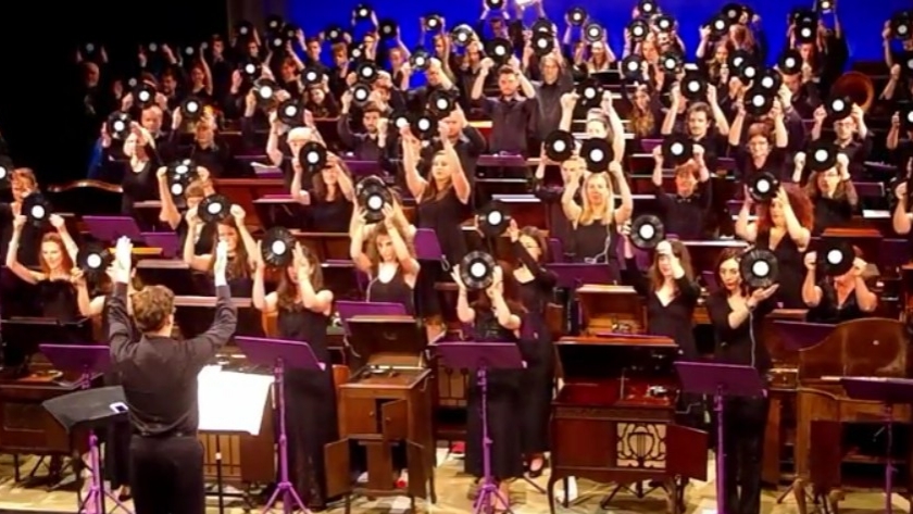Pedig megtörtént: Deraco komponált egy közel 40 perces művet, ezen megszólal a száz gramofonon, majd nyomtattatott 100 db ilyen lemezt, amelyeket a karmesteri intésére száz ember indít el, s az indítók fele kórusként is közreműködik a produkcióban!