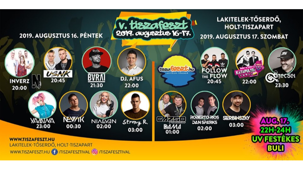 A két napos fesztivál már hagyományosnak mondható, hiszen ötödszörre telik meg a környék bulizó fiatalokkal. A főként neves dj-k alkotta fellépőgárda mellett idén négy nagyágyú is érkezik a színpadra. Péntek este az Inverz, a USNK és Burai Krisztián, míg szombaton a Follow the Flow csapata mozgatja át a fiatalokat. Utánuk mindkét nap hajnalig tartó dizsi veszi kezdetét. Ráadásul szombatra UV festékes bulival készülnek a szervezők, úgyhogy mindenképpen vigyetek váltóruhát! :)