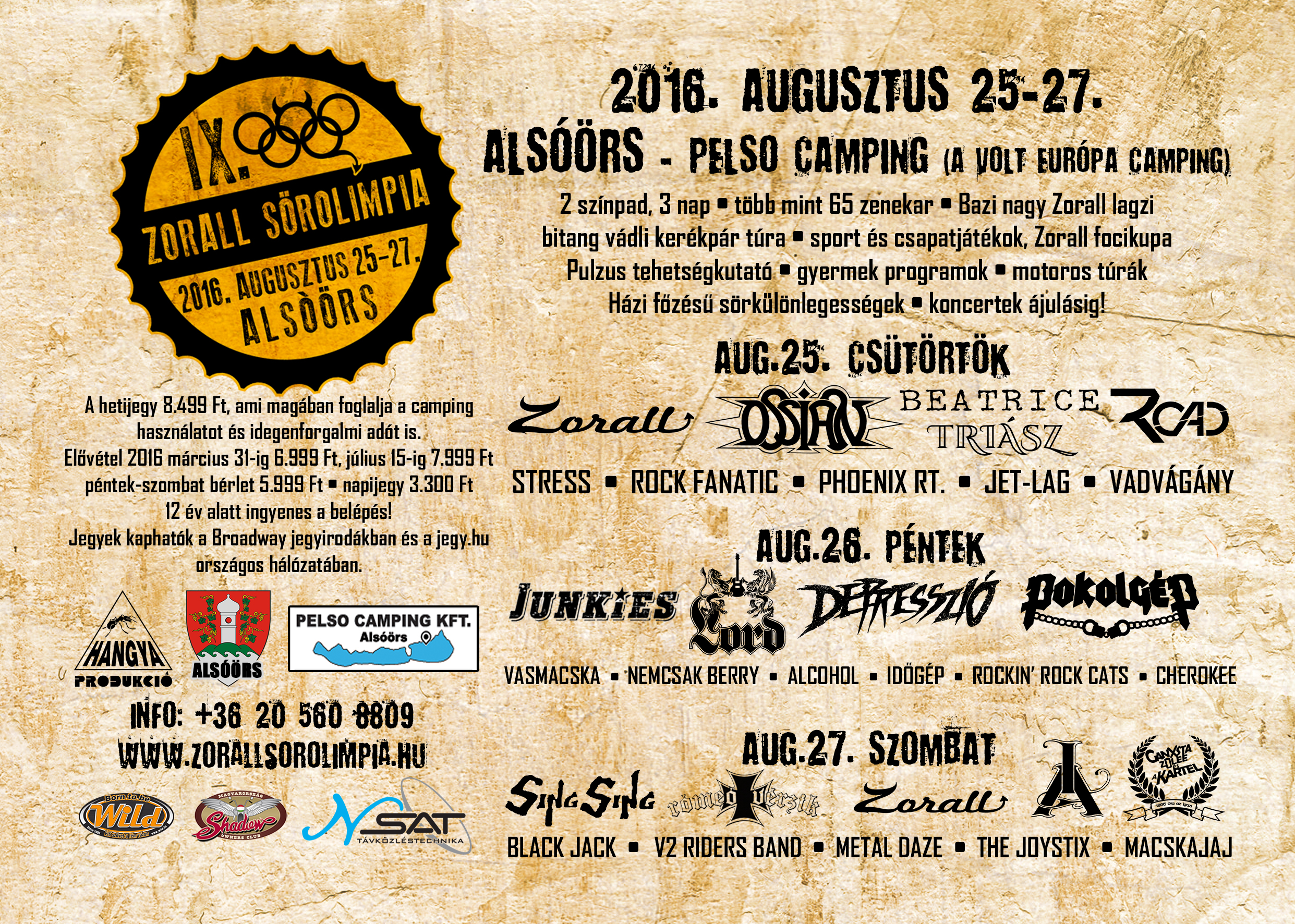 2016. augusztus 25-27. között kerül megrendezésre az idei, immáron IX. Zorall Sörolimpia. A fesztivál idén is Alsóörsön kerül megrendezésre, a korábbi Európa Camping területén, mely már a Pelso Camping nevet viseli. A nagyszínpadot a Vadvágány, a Cherokee és a Black Jack melegíti majd be, majd következnek a főzenekarok: Zorall, Ossian, Beatrice, Road, Junkies, Lord, Depresszió, Pokolgép, Sing Sing, Rómeó Vérzik, és az Ismerős Arcok.