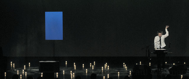 A koncert elején bejött egyszerű fekete nadrágban és fekete felsőben a mintegy 200 mécsessel megvilágított színpadra, előkapta az elektromos hegedűt, és a rá jellemző lehetetlen, kifacsarodott pózban nekiállt játszani, majd pár perc után leült a szintetizátor mellé, és elkezdett történeteket mesélni. A minimálvilágítás maradt is a koncert végéig, legföljebb a fényárnyalatok változtak olykor.