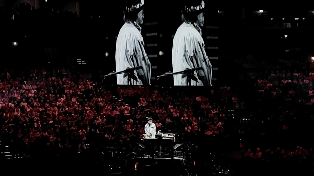 Pár szót a környezetről: aki részt vett a 2023-as arénakoncerten, az tudhatja, hogy akkor is középen volt a pódium – ez most is így történt. Az MVM Dome azonban lehetőséget adott arra, hogy még közelebb legyen egymáshoz a zenész és a közönség, hiszen a csarnok inkább magas, mint széles vagy hosszú.