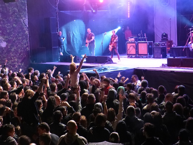 Az elején még viszonylag békésen „táncikáló” tömeg a végére egy megvadult csordára hasonlított, és ebben az átalakulásban fontos szerepe volt a zenekarnak is, akik folyamatosan ellátták feladattal a népet, nehogy megfázzanak a hidegben. A szokásos laza pogózást egy idő után kiváltotta a körbe-körbe-karikába nevezetű játék (circle pit), ami fentről úgy nézett ki, mintha valami rituális esőüldöző szertartáson lettünk volna. Ezek után már meg sem lepődtem a következő fordulón, amit „vízválasztó” névre kereszteltem (wall of death), hisz a fele jobbra, fele balra (akárcsak a politikában), majd hirtelen összecsapva koreográfia olyan tökéletes egységben működött, mintha évek óta ezt gyakorolták volna. A hab a tortán a leguggolós rész - megjegyzem, ezt egyre több zenekar alkalmazza -, ami tekintettel arra, hogy a koncert vége felé volt, a közönség felülnézetből leginkább egy elázott galambseregre emlékeztetett. Mindeközben a színpadon a fiúk és az egy szem leány rendületlenül nyomta a már ismert dalokat, és bár készültek volna még némi meglepetéssel, ez alkalommal beértük Imre Norbert (Prosectura) egész színpadot uraló megmozdulásával, amit a Húzzál gumit című közös dalban alkotott.