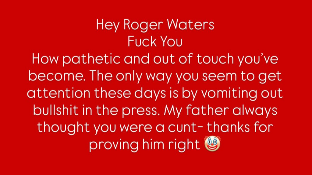 „F-k you, Roger Waters. Milyen szánalmas és önhitt lettél. Apa mindig is azt gondolta rólad, hogy egy cun* vagy – köszönöm, hogy igazoltad.”