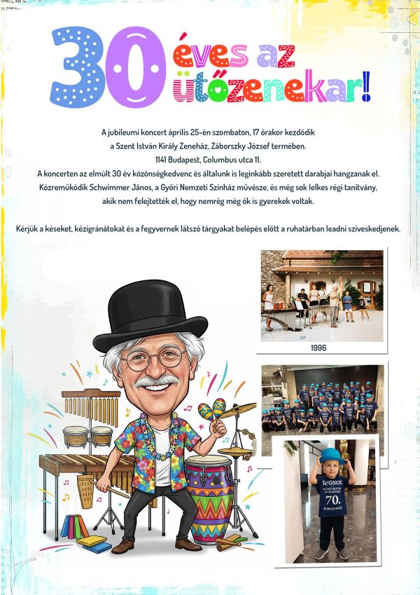 A zenekar 1996-ban alakult meg a Szent István Zeneiskolában, januárban már el is kezdődtek a próbák. Az első fellépések Tihanyban voltak az ottani zeneiskola zenei táborában. Minden nap térzenét adtunk az apátság oldalában, vagy a Rege cukrászda udvarán. Nem várt sikere volt a kezdeményezésnek, viszonylag gyorsan híre ment a zenekarnak. Sok zenekedvelő hallgató az ütőzenekar miatt jött át a környékbeli településekről. Ez alatt a harminc év alatt számtalan fellépésünk volt, közöttük sok jótékonysági koncertet is adtunk. A teljesség nélkül kiemelném Szögi Lajos meggyilkolt tanár családjáért adott hangversenyt, valamint hogy egy súlyos beteg kislány külföldi gyógykezeléséért is gyűjtöttünk.