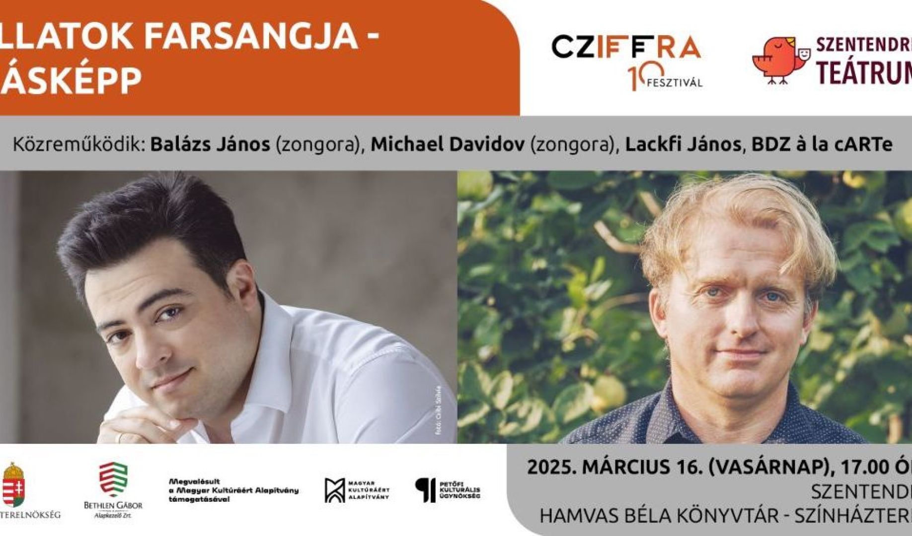Már a reneszánsz madrigálok világában is kísérletet tettek arra, hogy állatok jellegzetestulajdonságait jelenítsék meg a zenében. Nem voltak ezzel másképp a későbbi korok zeneszerzői sem, de mind közül talán Camille Saint-Saëns ment a legmesszebb, aki egy több tételből álló ciklusban jelenítette meg az állatok farsangját. Ezen a farsangon azonban nem csak állatok vannak. A szerző ugyanis az állatok közé sorolta a skálákat gyakorló zongoristákat is, de egyik-másik állat zenéjénél megjelenik egy-egy Offenbach- vagy Wagner-paródia is. Saint-Saëns zenéje eredetileg is farsangi szórakoztatásra készült. Ezen az estén azonban nemcsak a francia mester humora és karakterérzéke gondoskodik a közönség szórakoztatásáról, hanem Lackfi János ehhez a műhöz készült versei, más szerzők állat-zenéinek felidézése és Balázs János, valamint Michael Davidov virtuóz zongorajátéka is, melyben partnereik a BDZ à la cARTe Kamaraegyüttes tagjai. Lackfi János így írt a versek alkotásáról: „Az állatok elképesztő viselkedése, külleme pazar képet mutat a Teremtő kifogyhatatlan játékos szelleméről. …. Nagyszerű mulatság volt Saint-Saëns úr állattárának minden egyedéről valami kedves, frappáns, zsivány szókompozíciót kanyarítani. Eljátszani a vasvödröt is összegyűrő kenguru erejével, a hattyú szépséges agresszivitásával, a vegánná lett oroszlán marconaságával, a porcelánboltban ténfergő elefánt ormótlanságával, a lassítottfelvétel-