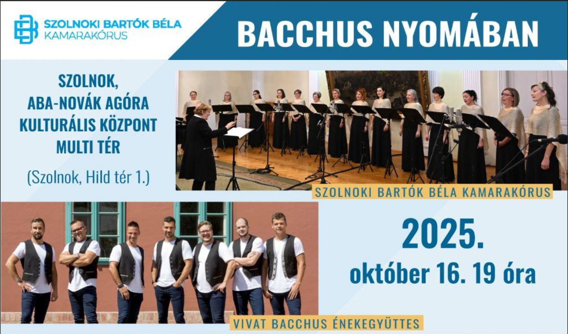 A Vivat Bacchus Énekegyüttes nem csupán énekel – ők életérzést közvetítenek. Repertoárjuk középpontjában a bordalok állnak, amelyekben a magyar borvidékek hangulata, a barátság melege és az éneklés öröme fonódik össze. Előadásmódjuk közvetlen, humorral fűszerezett és igényes. Olyan élményt nyújtanak, amely egyszerre szórakoztat és elgondolkodtat. A színpadon nemcsak hangok,hanem történetek, érzések és pillanatok kelnek életre, egy pohár jó bor mellé való, zamatos zenei csemegék formájában. Ezen az esten a Szolnoki Bartók Béla Kamarakórus és a Vivat Bacchus Énekegyüttes közös hangversenyét élvezheti a szolnoki hallgatóság.