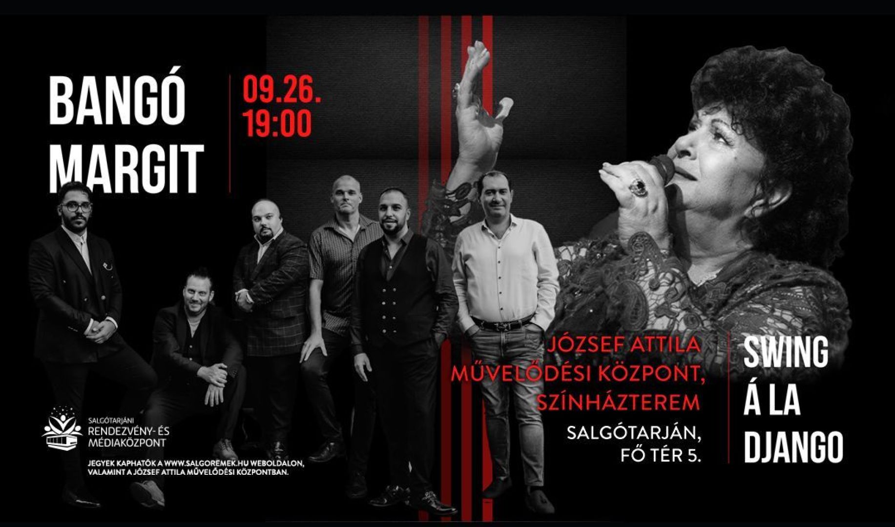 Szeptember 26-án különleges koncertélmény várja a salgótarjáni közönséget, ugyanis először lép fel a városban a Kossuth-díjas előadóművész, Bangó Margit. A több mint öt évtizedes zenei pályát maga mögött tudó művésznő ez alkalommal a legismertebb és legszemélyesebb dalait hozza el a színpadra, méghozzá a kiváló Swing à la Django zenekar kíséretében.