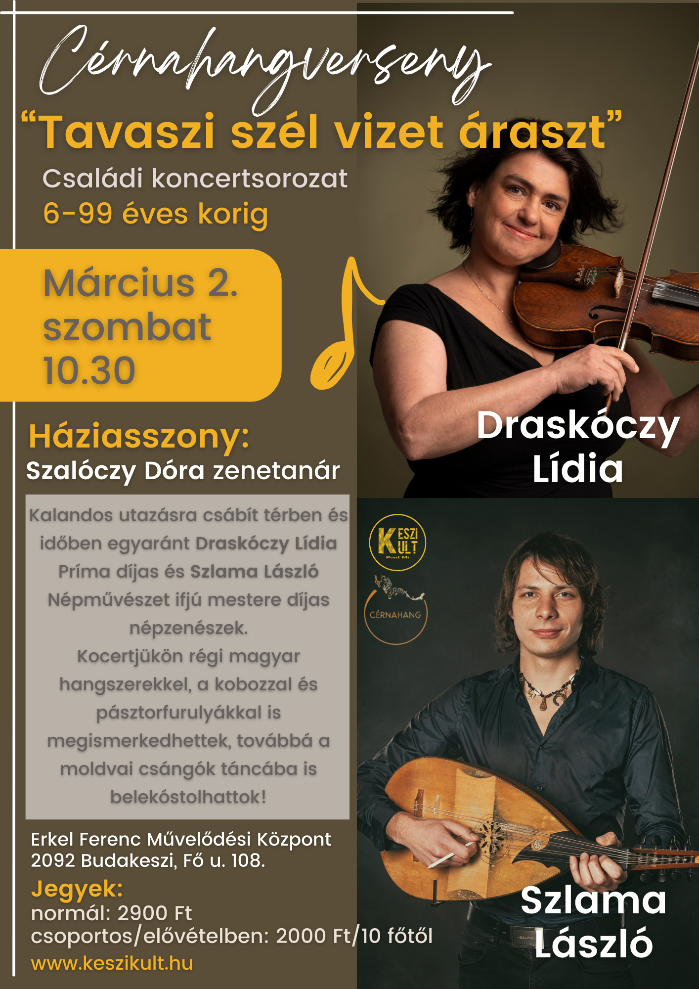 Kalandos utazásra csábít térben és időben egyaránt Draskóczy Lídia Príma díjas és Szlama László Népművészet ifjú mestere díjas népzenészek. Kocertjükön régi magyar hangszerekkel, a kobozzal és pásztorfurulyákkal is megismerkedhettek, továbbá a moldvai csángók táncába is belekóstolhattok!