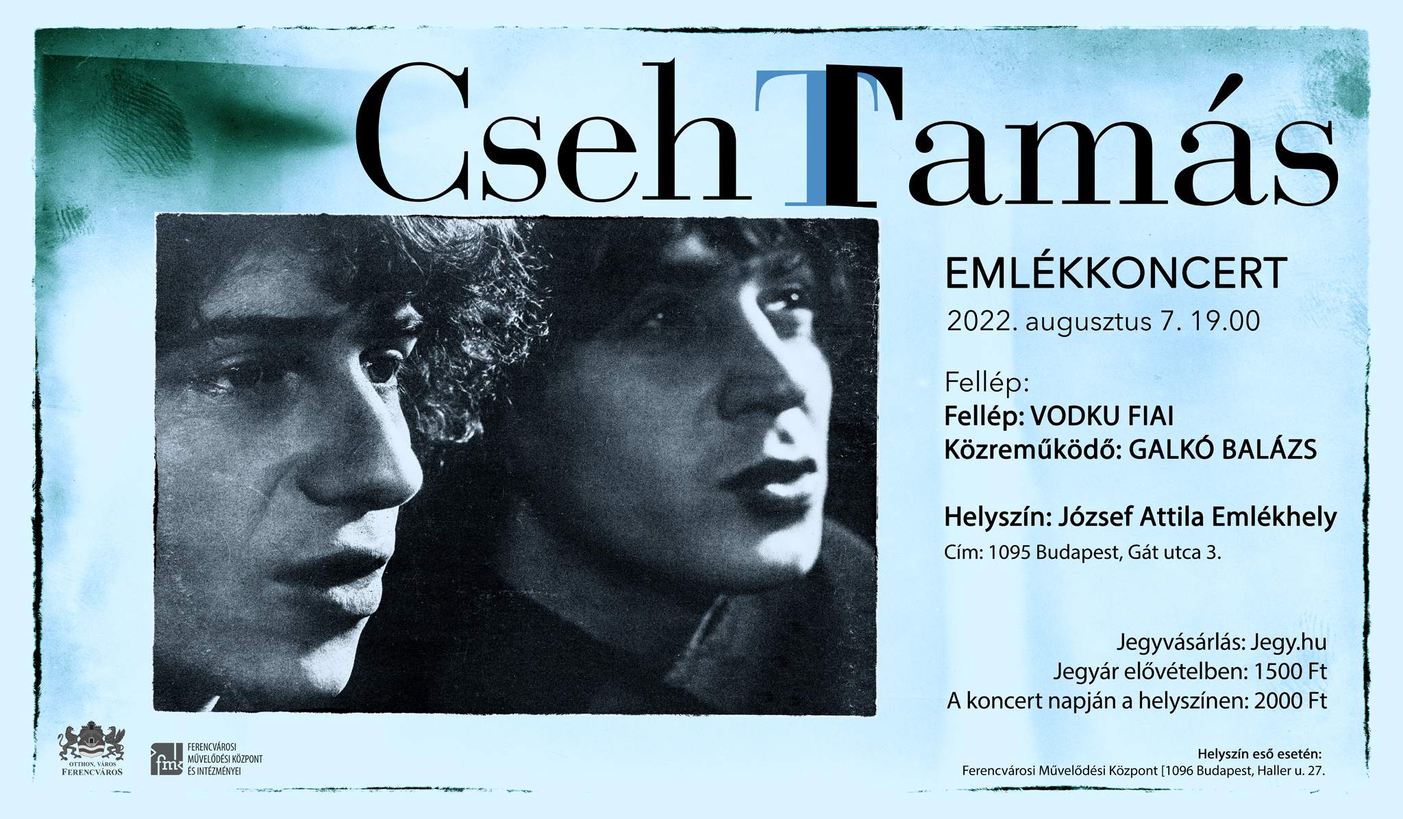 A Vodku fiai zenekar augusztus 7-i koncertjeivel hagyományt teremtett Ferencvárosban. Idén is szeretettel várunk mindenkit, aki szeretné meghallgatni és velünk énekelni Cseh Tamás és Bereményi Géza dalait, és immár ötödszörre is megtapasztalni, hogy a Budapest, a Hatvanas évek, a Keresztben jégeső, az Életem utolsó gesztusa, az Égboltsapkájú és más dalok az évtizedek során újra és újra új értelmet nyernek.