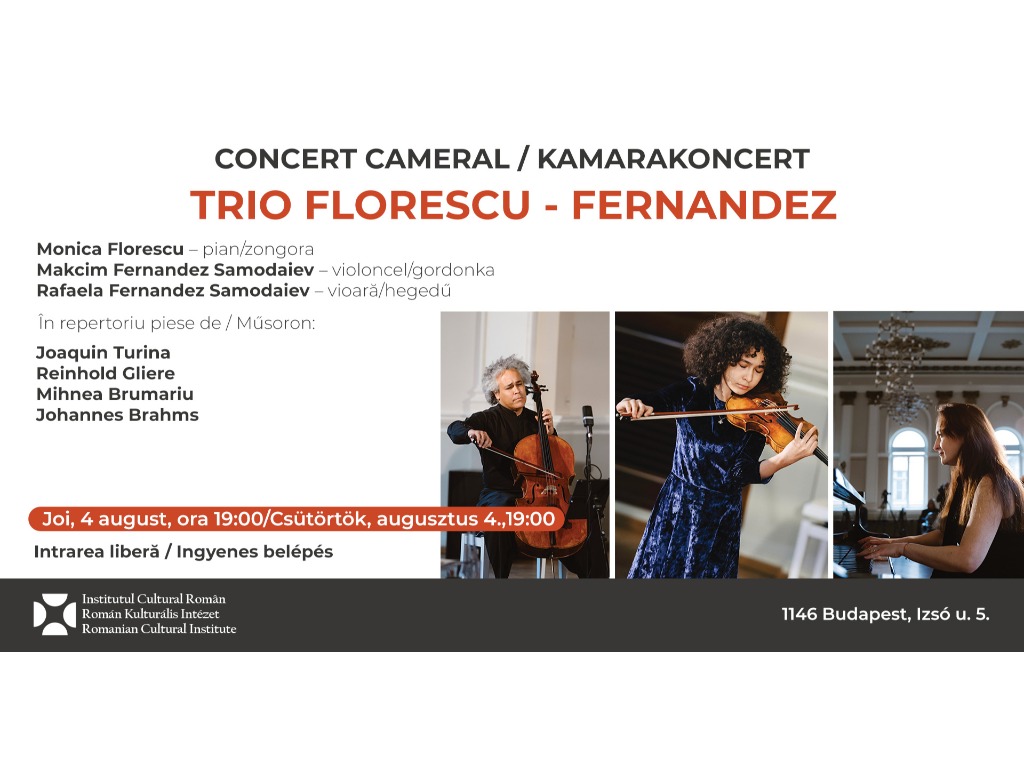 2022. augusztus 4-én, csütörtökön 19.00 órakor a Budapesti Román Kulturális Intézet kamarakoncertet szervez székházában. Közreműködik a Florescu–Fernandez Trió, amelynek tagjai: Monica Florescu – zongora, Makszim Fernandez Szamodajev – cselló és Rafaela Fernandez Szamodajev – hegedű.