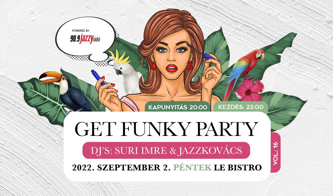 Szeptember 2-án ismét GET FUNKY PARTY a Kopaszi-gáton. Lassan kúszunk bele az őszbe, de a Le Bistroban még felforrósítjuk a hangulatot a legjobb funky zenékkel. A buli házigazdái: DJ Jazzkovács László és Suri Imre.