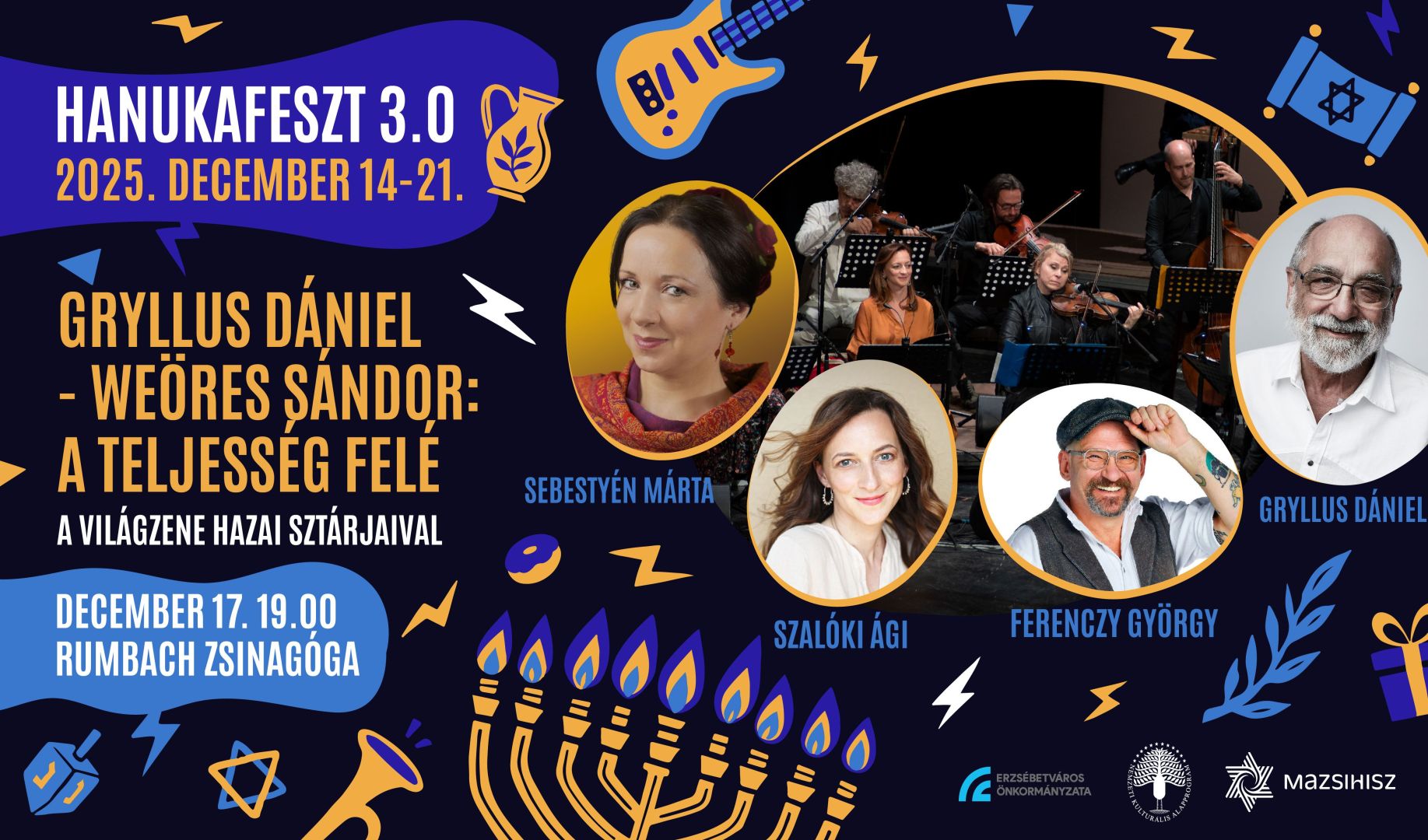 Gryllus Samu vezényletével ez a kivételes társulat – nyolc fantasztikus énekes és tíz, nemzetközileg is elismert zenész – Weöres Sándor időtlen gondolatait és költői szavait kelti életre. Egyetlen estére a Rumbach zsinagóga impozáns terében születik újjá A teljesség felé, hogy fényt hozzon és közös ünneplésre hívjon bennünket. Jöjjenek, és ünnepeljük együtt Hanukát ebben a lenyűgöző társaságban!