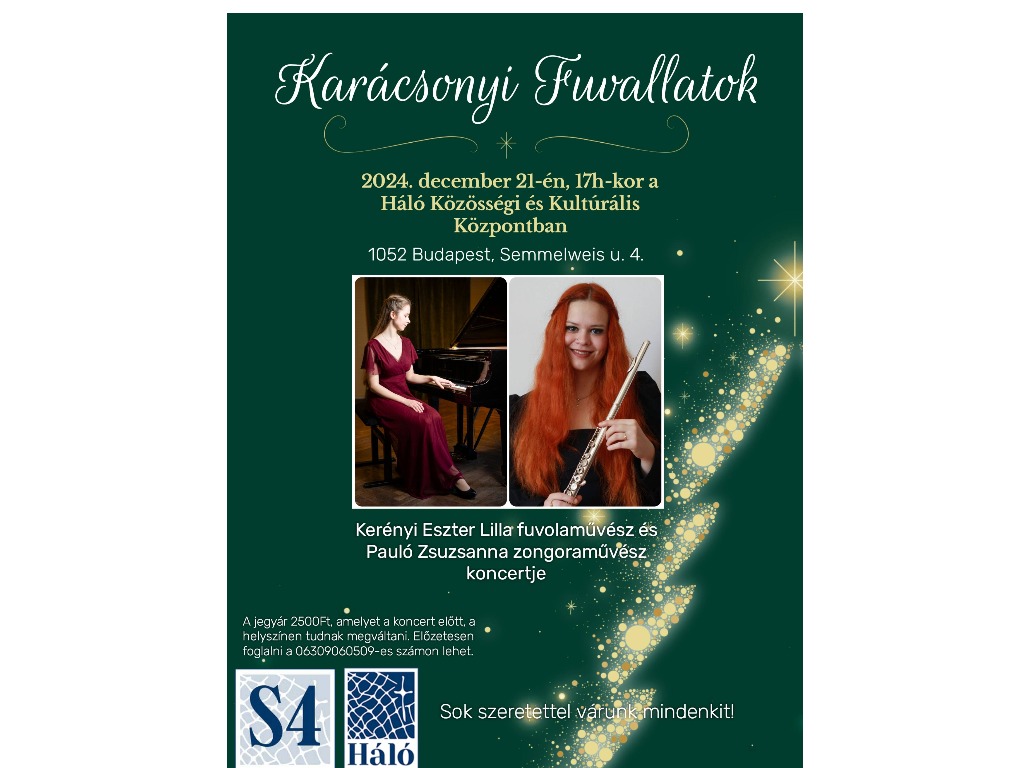 Sok szeretettel várunk minden érdeklődőt az immáron 4. éve megrendezésre kerülő, "Karácsonyi Fuvallatok" c. adventi hangversenysorozat koncertjére a Háló Közösségi és Kulturális Központba!