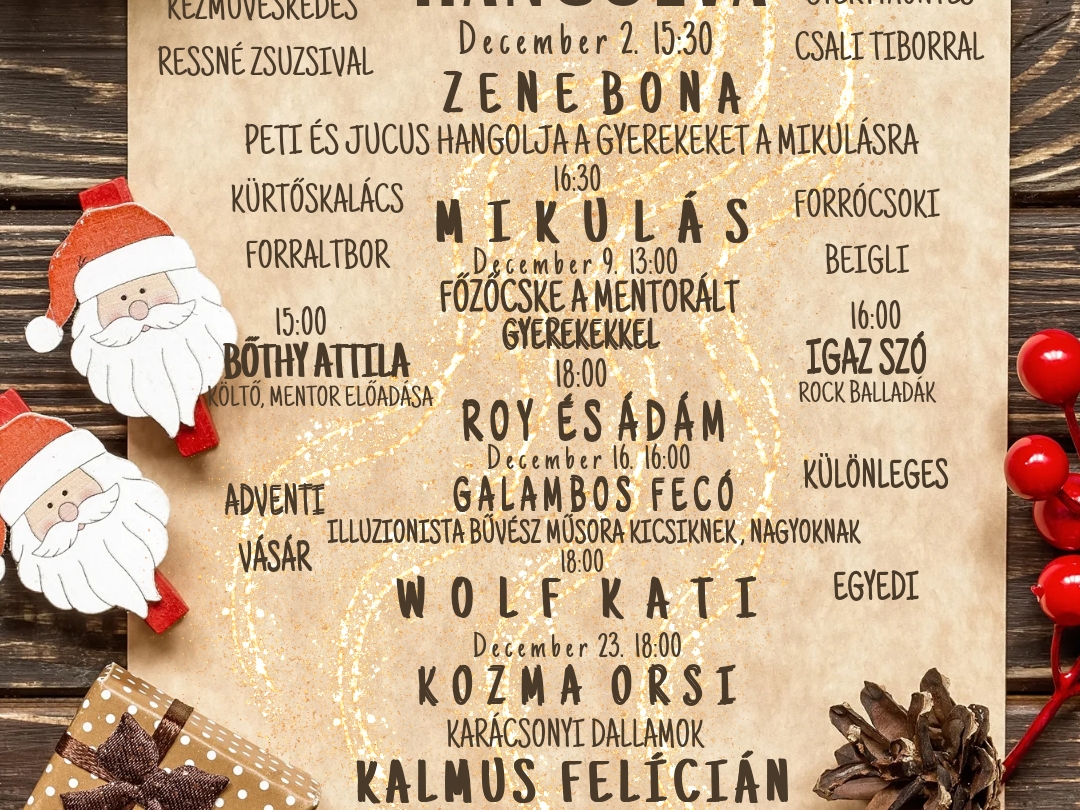 ▶️ 15:30 A Zene - Bona együttes Jucussal és Petivel fogja a Mikulás érkezésére hangolni a gyerekeket, mert hozzánk előbb érkezik egy kicsit, hogy minden házhoz odaérjen.