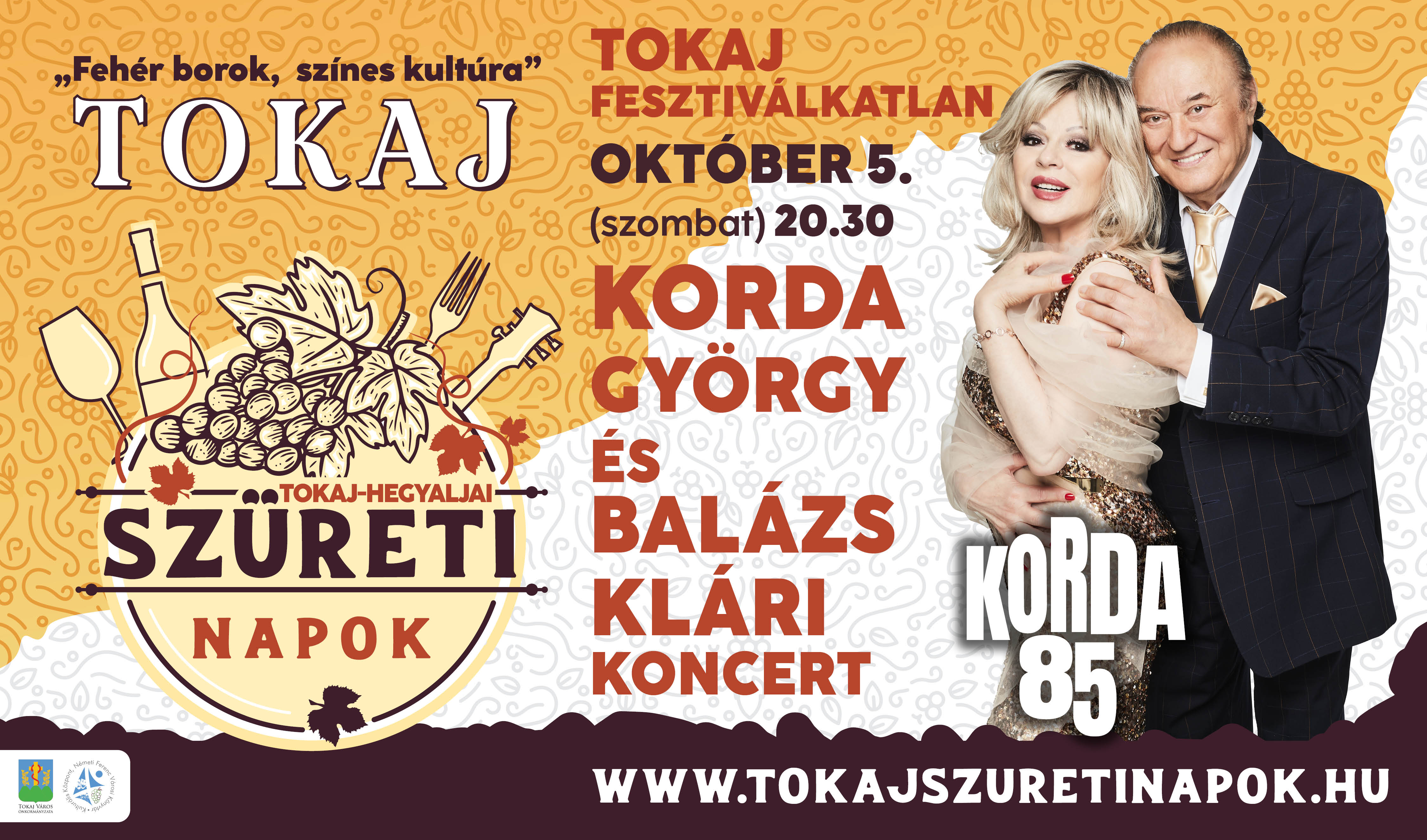 Az idén 85 éves Korda György és felesége, egyben duettpartnere, Balázs Klári a legnépszerűbb Korda-Balázs slágerekkel és látványos színpadi show-val készül a Tokaj-hegyaljai Szüreti Napokra. Reptér, Lady N.., Mamma maria...Számtalan örökzöld, melyek mind felcsendülnek majd.