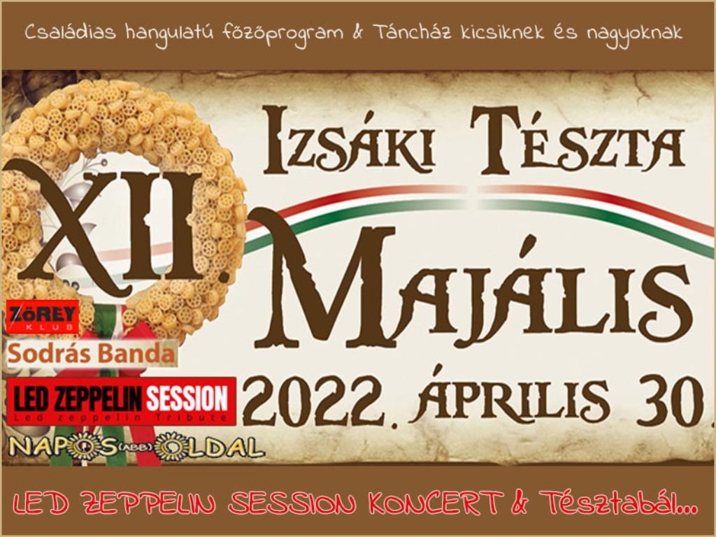 2022. április 30-án, a Vino étterem vén-diófás kerthelyiségében kerül megrendezésre a XII. Izsáki Tészta Majális. A családias hangulatú főzőprogram mellett táncházat, rock koncertet és tésztabálat rendez az izsáki ZÖREY klub.