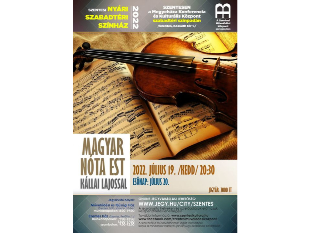 akár gondol a hazára. Wass Albert verse jól összefoglalja a magyar nótával kapcsolatos gondolatainkat és érzéseinket. Kállai Lajossal és zenekarával már találkozhatott a szentesi közönség, hiszen 2021-ben a megújult Tóth József Színházban adtak koncertet. Ez alkalommal is felcsendülnek az örök klasszikusok mellett magyar népdalok és operett slágerek is.