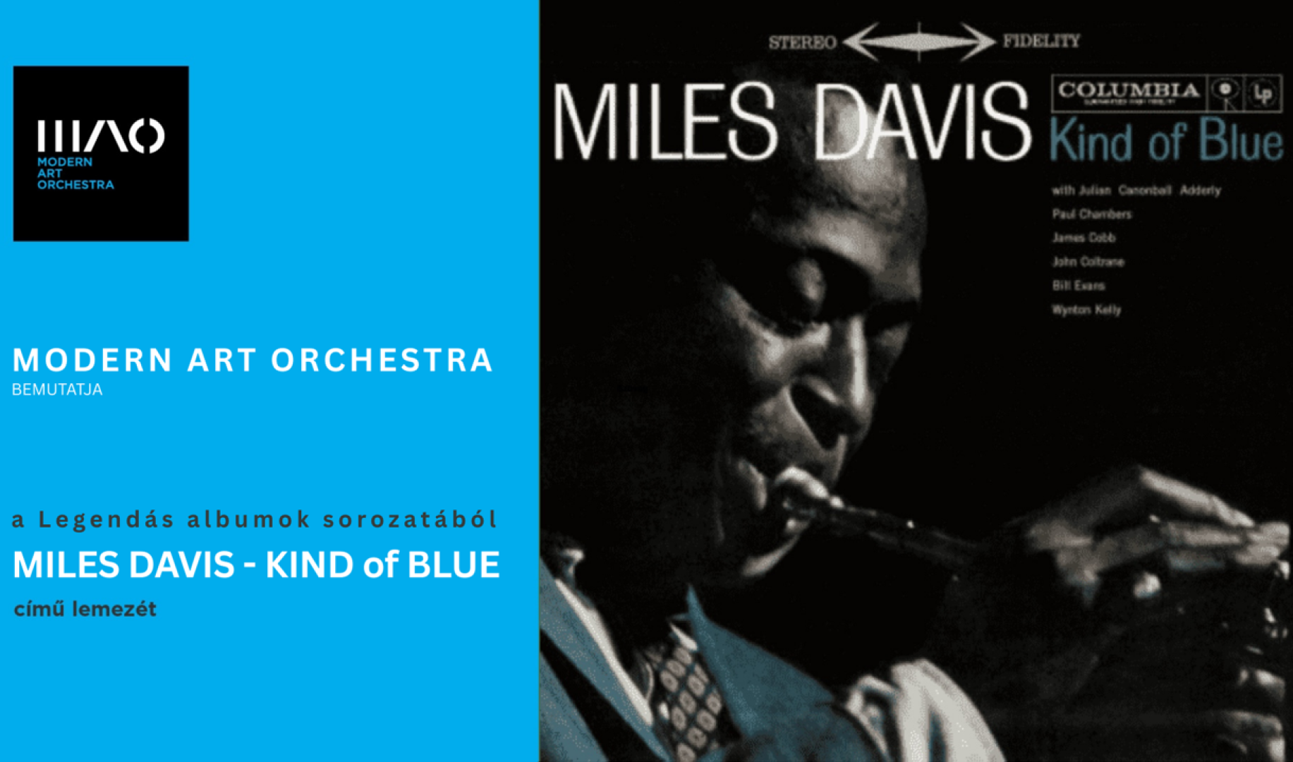 A Kind of Blue a modális jazz mérföldköve, egyben az improvizáció szabadságának egyik legtisztábban megszólaló példája. A Modern Art Orchestra előadása nem csupán tisztelgés, hanem párbeszéd ezzel az örökérvényű anyaggal – ahogyan a lemez szereplői (Miles Davis, John Coltrane, Cannonball Adderley, Bill Evans, Paul Chambers, Jimmy Cobb) saját hangon szólaltak meg, úgy teszik ezt most a MAO zenészei is.