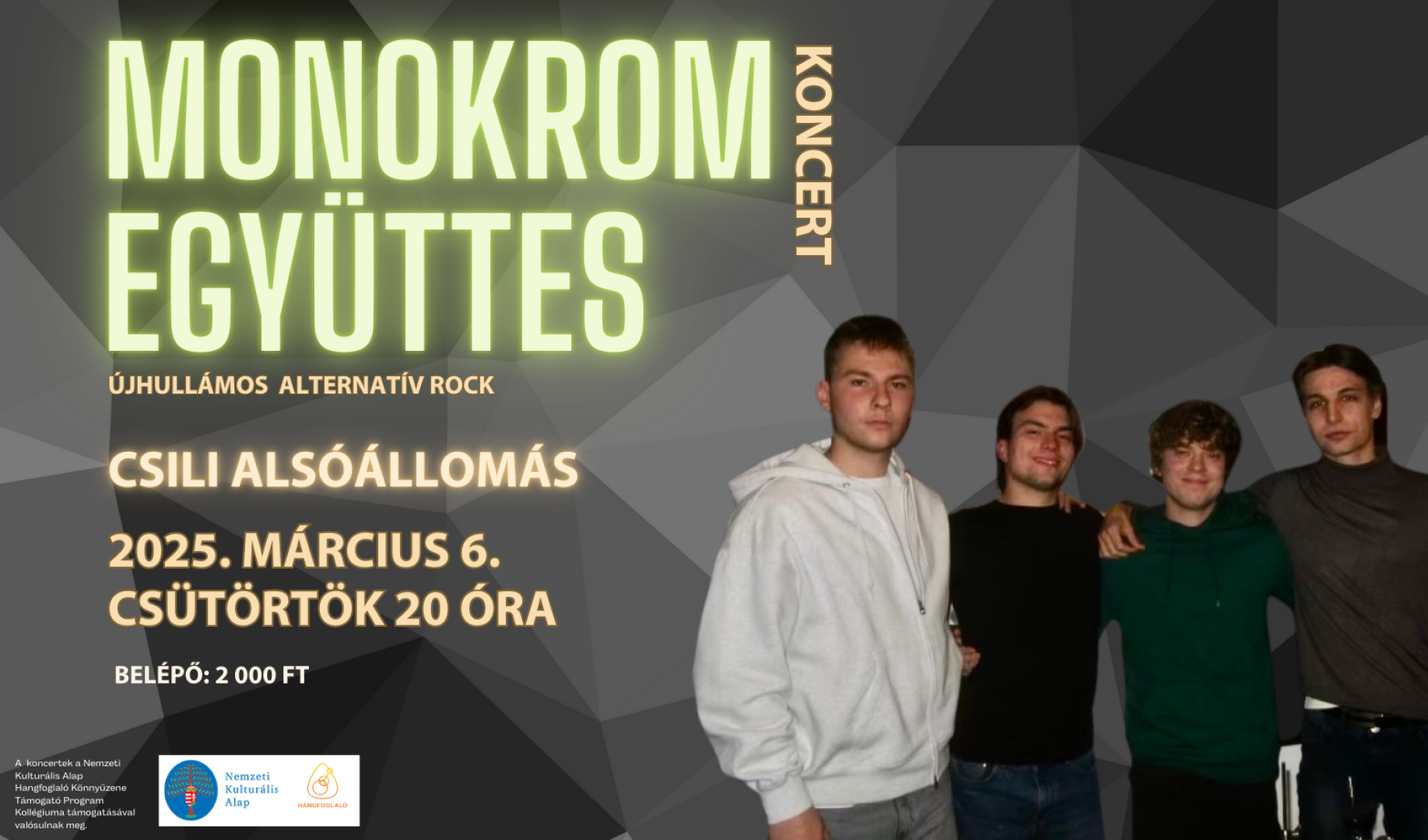 A Monokrom, jelenlegi felállásában 2024-ben alakult. Első lemezük pedig 2025 januárjában jelent meg. Zenéjük az újhullámos alternatív rock zene szcénáját erősíti, de bárkinek izgalmas lehet, aki meghallgatja. Életigenlésük, hangzásuk és ambícióik pedig előbb-utóbb hozzád is elérnek!