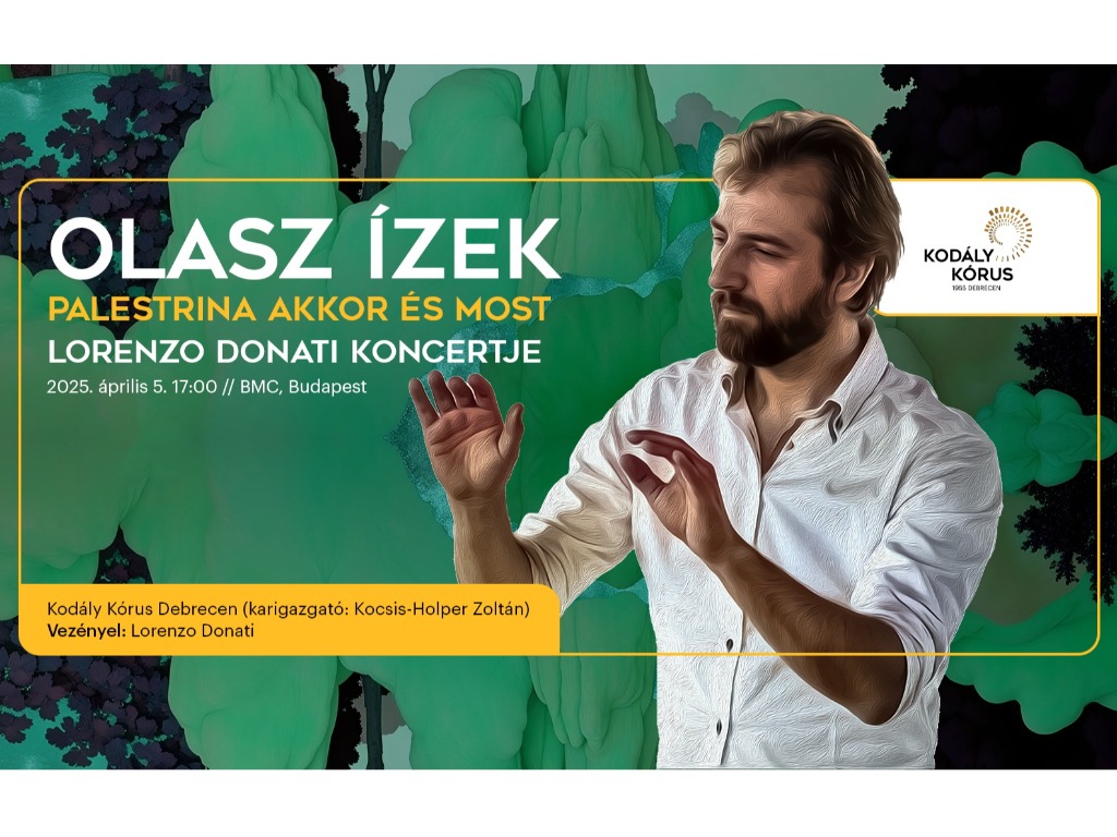 A reneszánsz vokálpolifónia ötszáz éve született itáliai mestere, az „egyházi zene megmentője”, Giovanni Pierluigi da Palestrina máig meghatározó alakja a kóruskultúrának, letisztult stílusának tanulmányozása kötelező anyag a zeneszerzés szakokon. A többszörös díjnyertes olasz karnagy és komponista, Lorenzo Donati, aki többek közt Ennio Morricone tanítványa is volt, a Kodály Kórus Debrecen élén Palestrina műveit saját kompozícióival és olasz kortársainak darabjaival vegyíti, hogy megmutassa: Palestrina csillaga fél évezred után is fényesen ragyog.