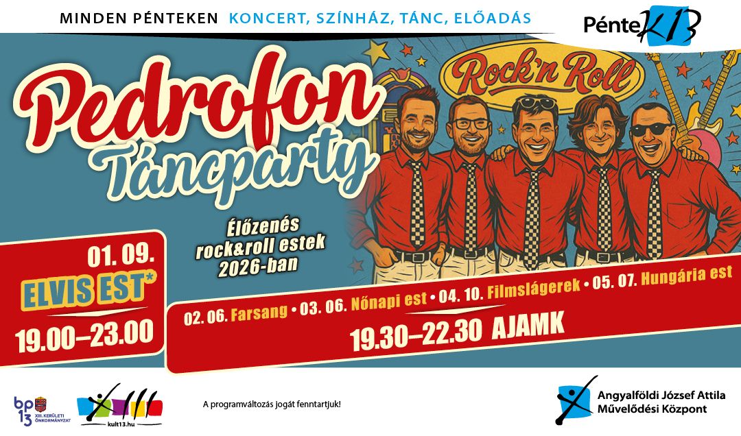 Immár hagyományosan, minden hónap első péntek estéjén fergeteges táncestekkel várjuk a táncoslábú közönséget az AJAMK színháztermében! Hazánk egyik legkedveltebb rock and roll zenekarának műsorán szerepelnek az ’50-es, ’60-as évek rock and roll slágerei, a Hungária örökzöldektől a Komár László nótákig. Sőt a ’30-as, ’40-es évek swing világát is felidézik, de feldolgozzák a hozzájuk közel álló közelmúltbéli számokat is.