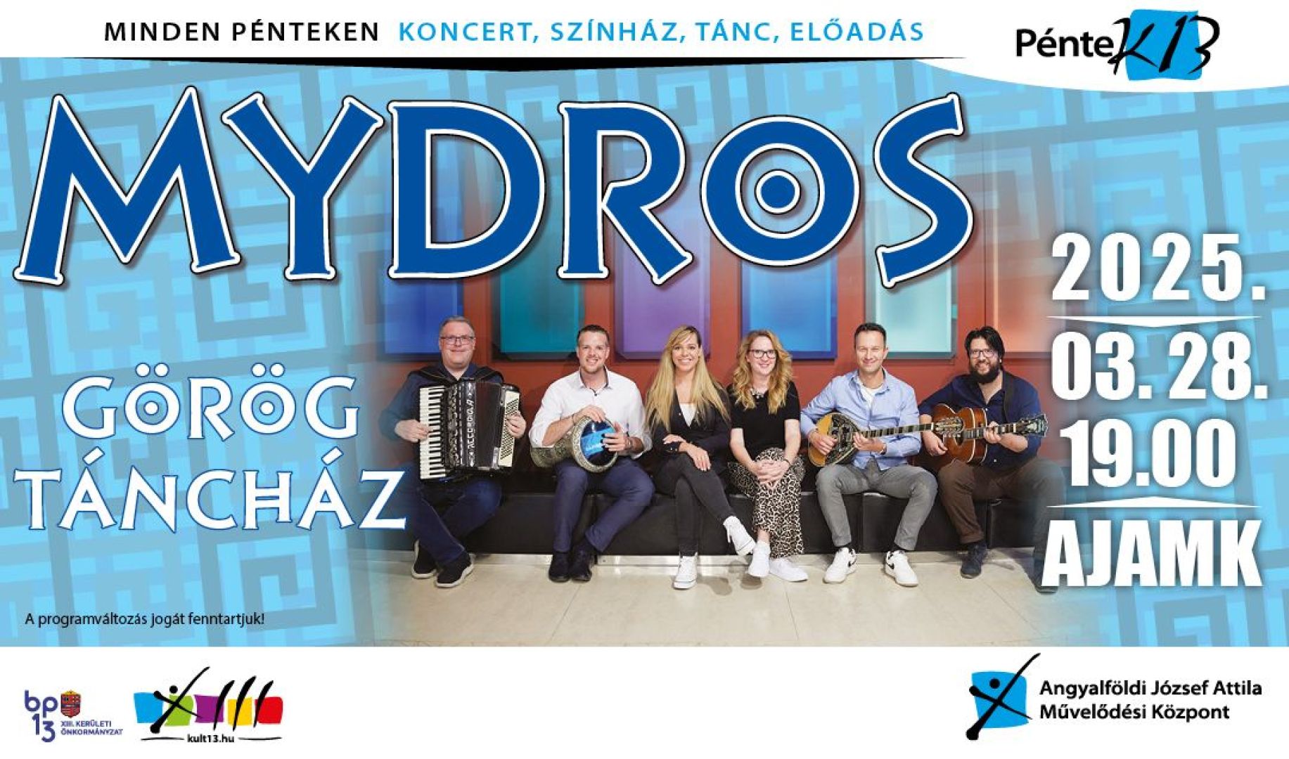 A nagy sikerű Mydros zenekar zenéjével elhozza a mediterrán tájak derűs, szívet, lelket melengető hangulatát! A zenekart 2001-ben alapították görög és magyar fiatalok, hogy megoszthassák mindenkivel azt az örömöt, amit a görög zene és tánc ad nekik gyermekkoruk óta, és táncházaikkal kulturált szórakozási lehetőséget biztosítsanak minden korosztálynak. Alapításuk óta több, mint 1500 alkalommal léptek színpadra. A hazai és külföldi zenei fesztiválokon kívül állandó fellépői görög táncházaknak, vacsoraesteknek, nemzetiségi műsoroknak, görög-magyar lakodalmaknak. Az együttes 11 alkalommal görögországi nyaralást is szervezett közönségének. Eddig két lemezt adtak ki. Hangszerelésük leginkább a görög városi zenéket idézi, de a több mint 400 számot felölelő repertoárjukban nagy helyet kap a hagyományos népzene és a mai görög zene is.