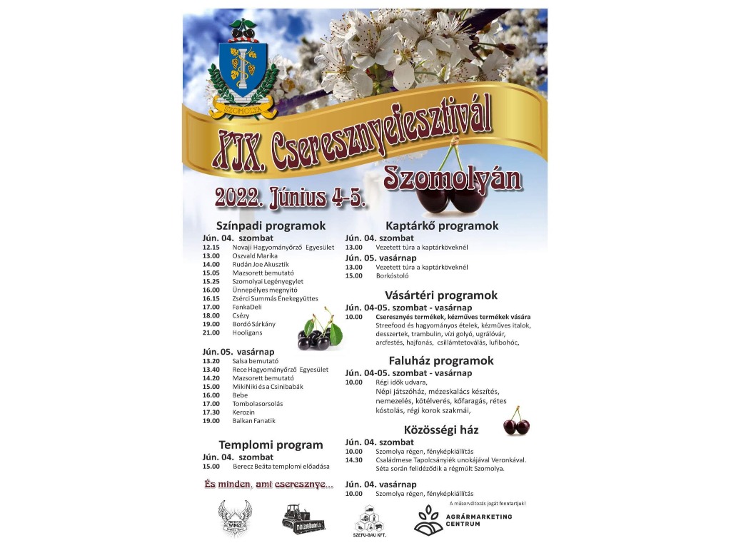 Csaknem két évtizede, 19. alkalommal rendezik meg idén a már legendaként számon tartott szomolyai Cseresznye Fesztivált. A mezőkövesdi járás ikonikus nyárindító bulijának messze földön híre van, csakúgy, mint a község világszerte ismert cseresznyéjének, amiért az ország legtávolabbi pontjáról is szívesen zarándokolnak a környékre a turisták: hiszen a szomolyai fekete az egyik legízletesebb cseresznyefajtánk.