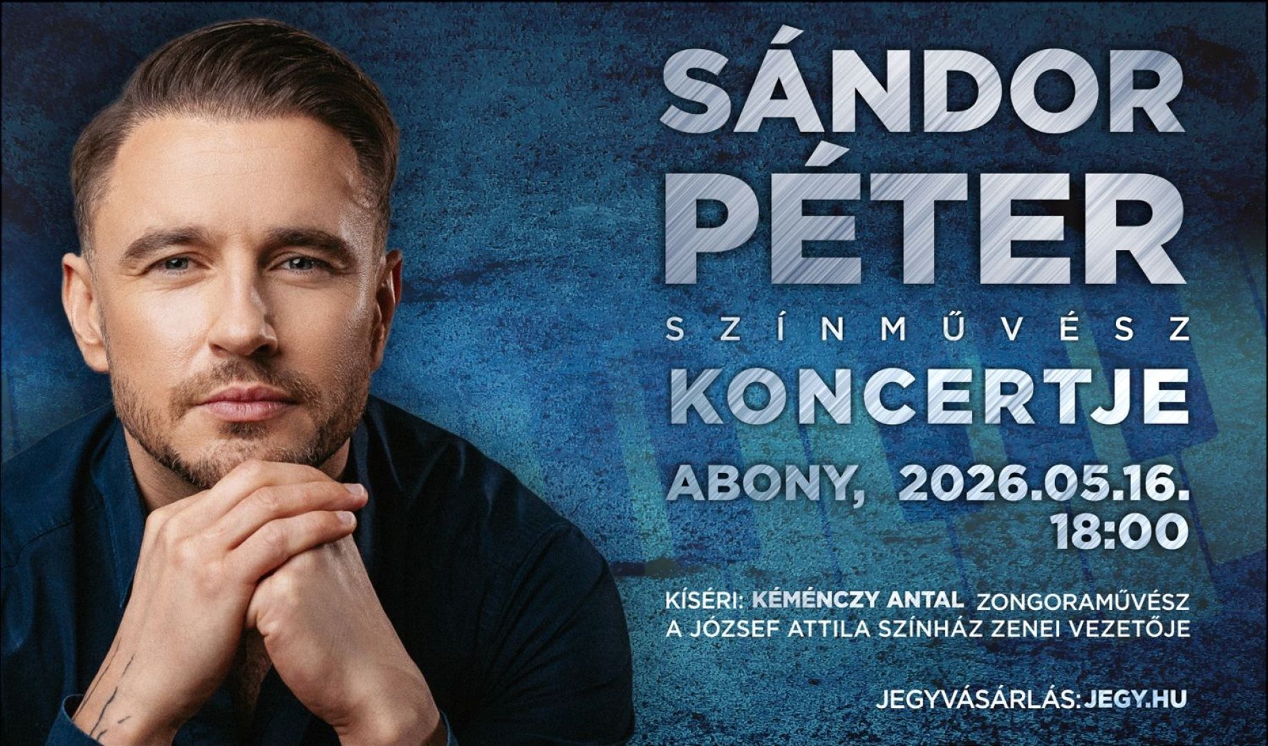 Sándor Péter egy különleges hangulatú koncerttel érkezik Abonyba. A színpadon Kéménczy Antal zongoraművész, a József Attila Színház zenei vezetője kíséri, közösen szólaltatva meg ismert musical- és operett dalokat, lírai gyöngyszemeket és néhány személyes meglepetést.