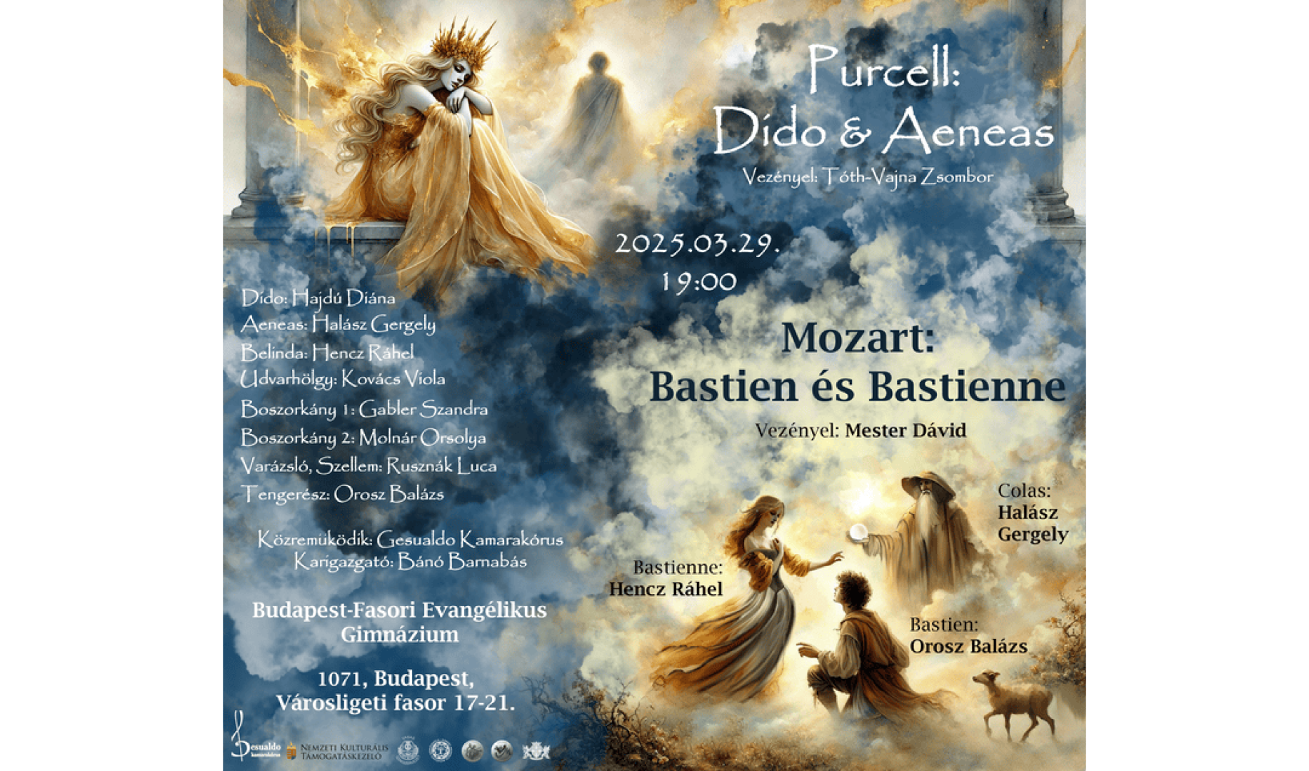 Henry Purcell ikonikus operája, a Dido & Aeneas megrázóan szép történetet mesél el szerelemről, árulásról és végzetről, míg Mozart bájos vígoperája, a Bastien és Bastienne könnyed humorával és játékos dallamaival varázsolja el a közönséget.