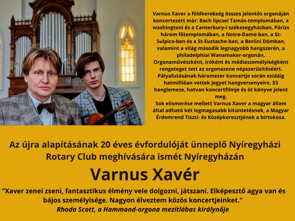 Az újra alapításának 20 éves évfordulóját ünneplő Nyíregyházi Rotary Club meghívására ismét Nyíregyházán hallható Varnus Xavér orgonahangversenye.