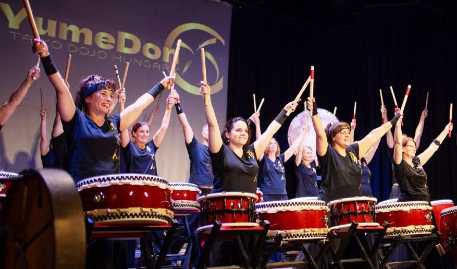 A YumeDon Taiko Stúdió előadásán több mint húsz dob szólal meg a színpadon.