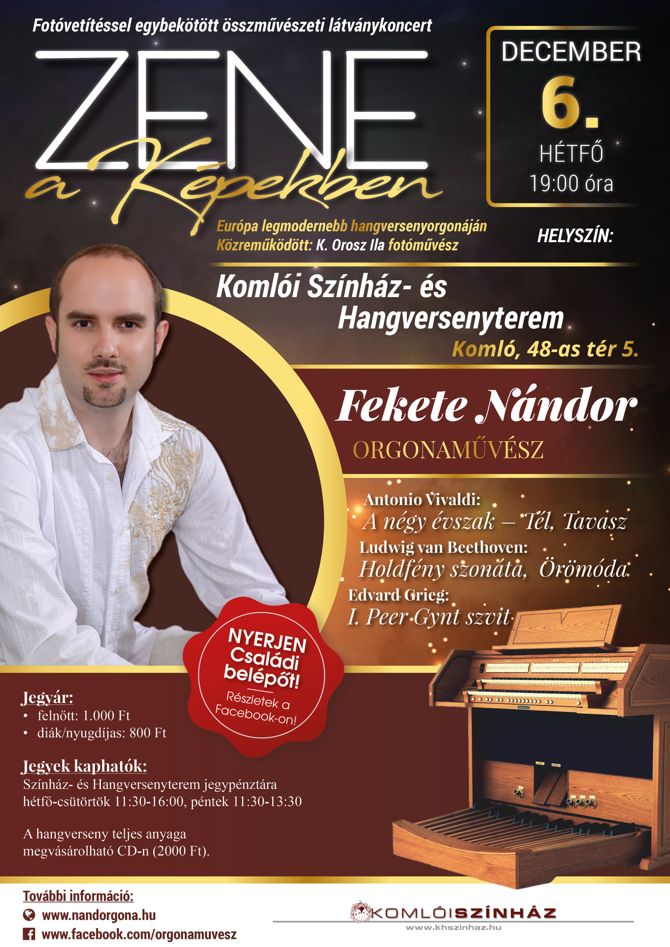 „Zene a képekben” címmel ezúttal egy olyan programzenei összeállítást álmodott meg, amely már a zenével egyenrangú szintre emeli a látványelemeket. A hangversenyen a közönség azokat a zenéhez időzített művészi fotókat láthatja a kivetítőn, amelyek a zeneszerzők lelki szemei előtt is lebeghettek a művek megalkotása közben.